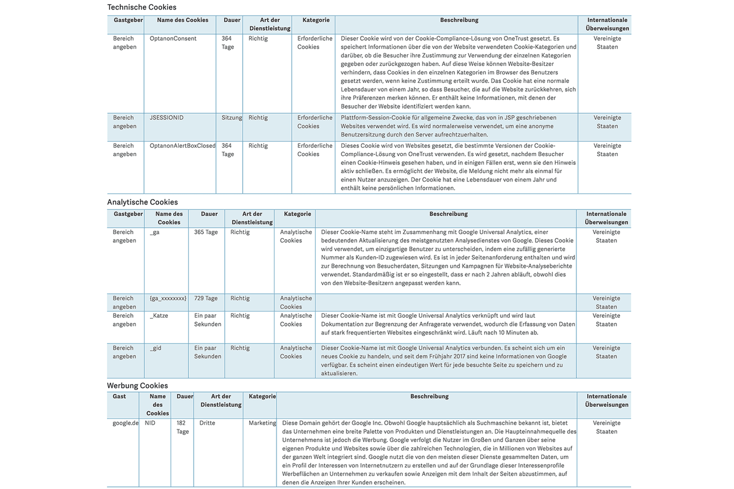 Sie können die von uns verwendeten Cookies unten einsehen: